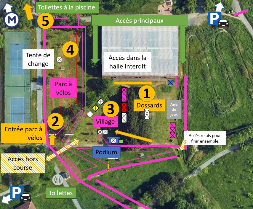 Vous repassez rapidement à votre emplacement dans le parc à vélos (n°4 du plan) pour déposer votre T-shirt et vos chaussures, puis départ toutes ensemble pour l’entrée principale de la piscine (située à environ 100 m), dans l’ordre des dossards de préférence. Vous montez à la piscine (n°5 du plan) avec uniquement les affaires de natation (en maillot ou en trifonction, pieds nus, avec la puce, le bonnet et les lunettes, et c’est tout), tout le reste vous attendra au pied de votre vélo. Vous ne pourrez pas laisser quoi que ce soit à la piscine, vous ne pourrez pas y retourner après la course. Vous aurez des toilettes à la piscine, et le passage par la douche est obligatoire.