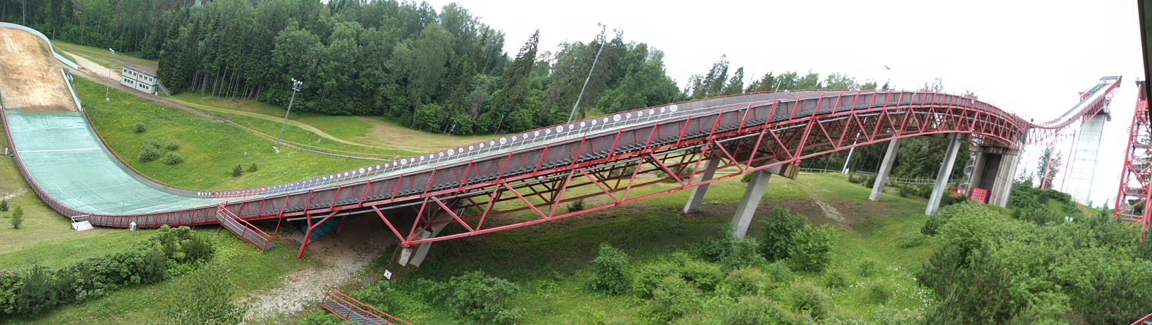 Ah… Et où c’est ça ? Hé bien en Estonie, tout près d’un lac prétendument magique, à des latitudes où à la mi-juin le soleil se couche à 22h15 pour se relever à 4h05, en ayant laissé au milieu un jour sombre à la place de la nuit noire. Le nom de la ville veut dire “Tête d’ours“, et elle abrite une station de sports d’hiver et notamment un tremplin de saut à ski K90, qui impressionne rien qu’en le visitant :